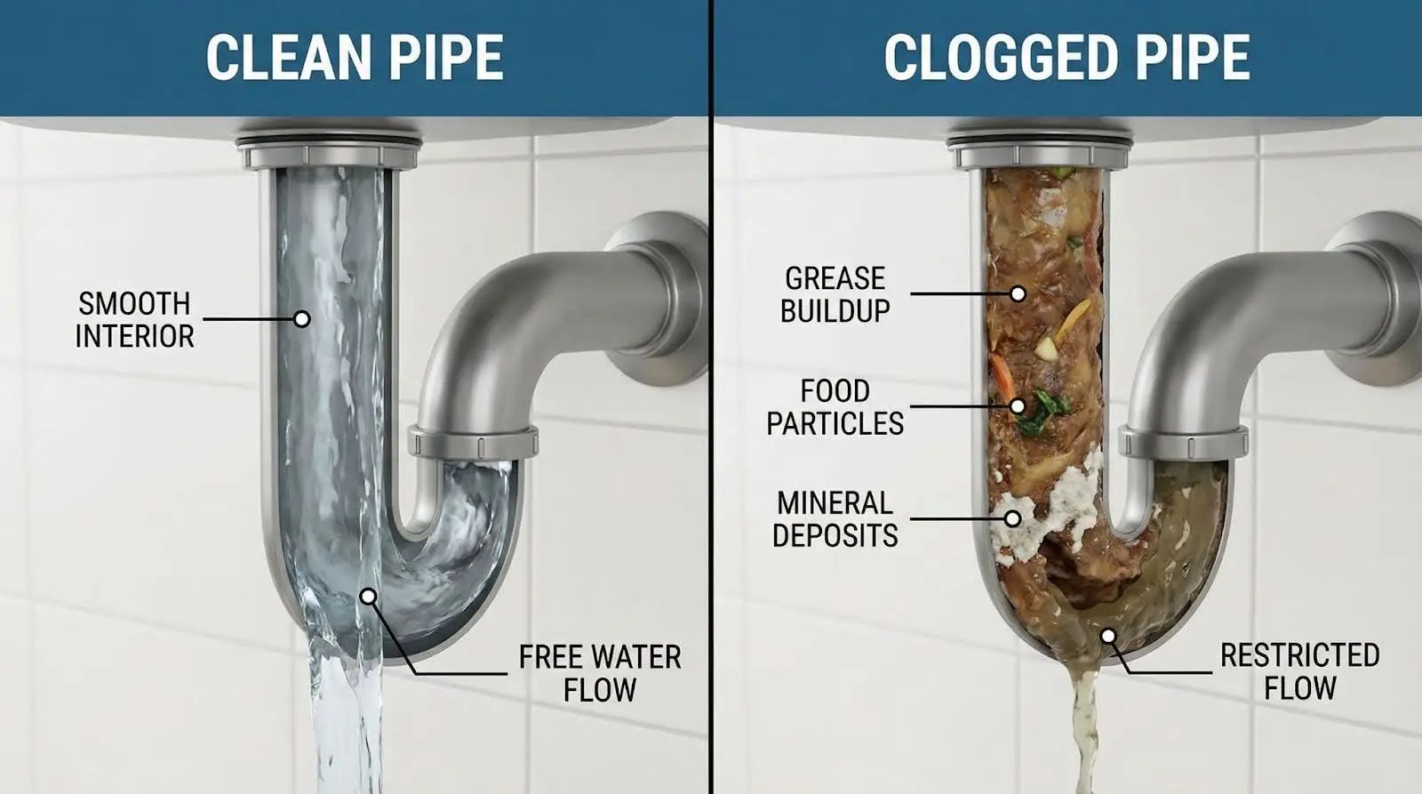 Food doesn’t need to be large to cause problems. Tiny particles accumulate over time, especially in the P-trap—the curved section of pipe under your sink designed to hold water and block sewer gases.