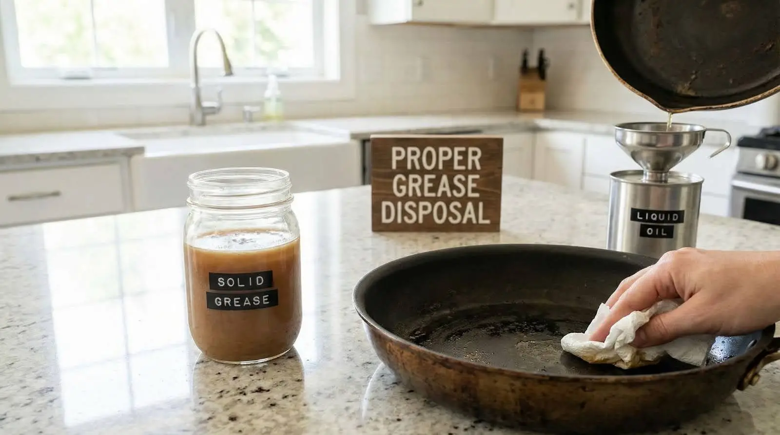 Never pour grease down your kitchen drain. Let cooking fats cool and solidify, then scrape them into the trash. For liquid oils, pour them into a disposable container and throw it away.