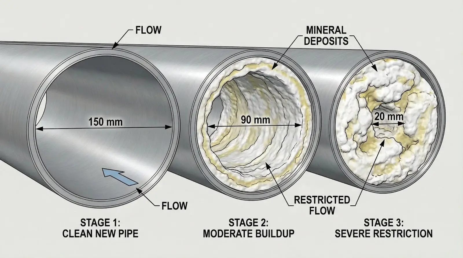 Mineral deposits form slowly but persistently. Each time water flows through your pipes, a microscopic layer of minerals adheres to the pipe walls. Over months and years, these layers build up.