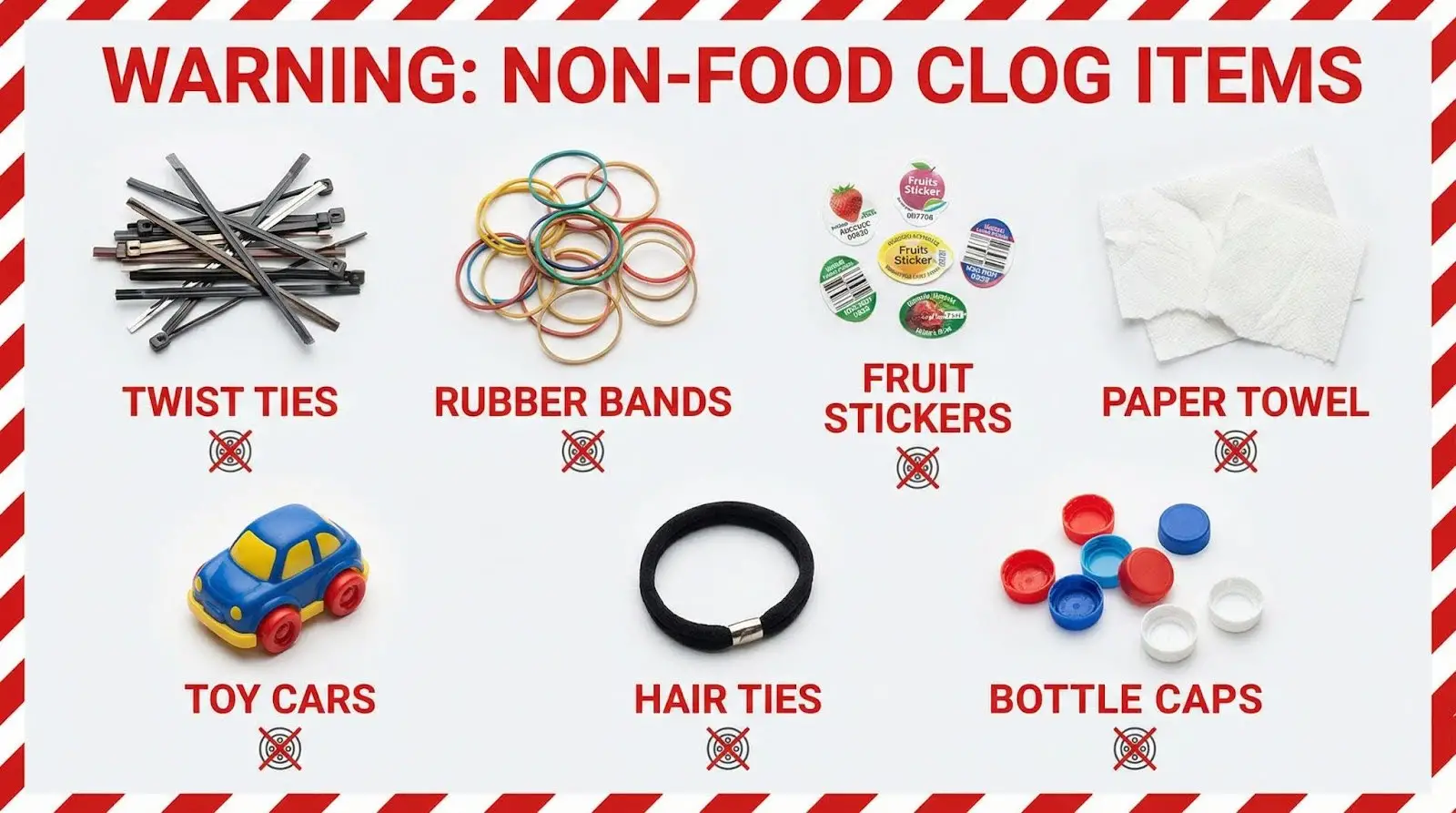 - Potato peels: Starchy residue combines with other materials to form dense blockages