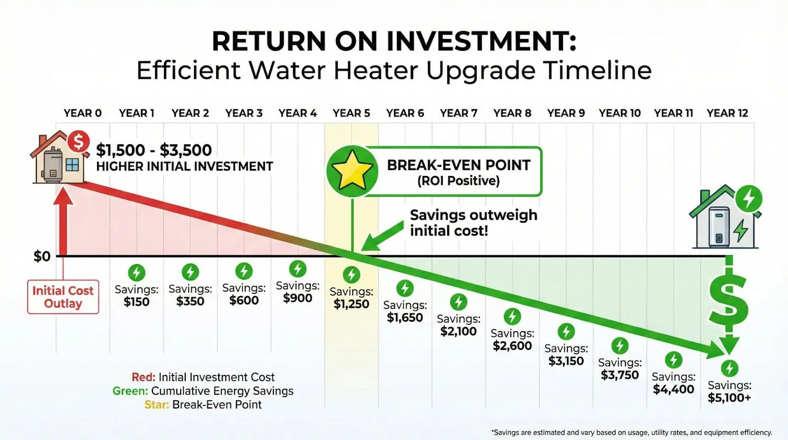 - Heat pump water heaters and other high efficiency models cost more up front but can offer long term savings on utility bills.