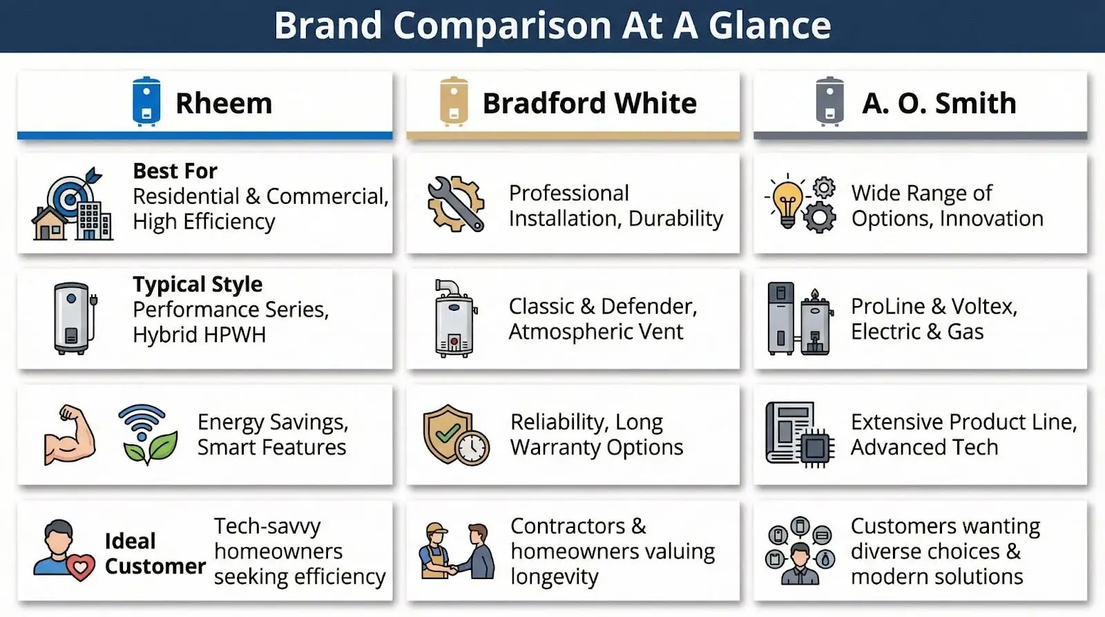 Feature | Rheem | Bradford White | A. O. Smith |