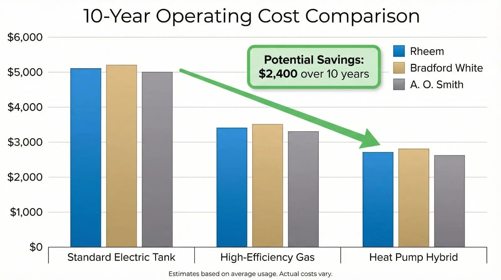 - A. O. Smith and Rheem both offer highly efficient models, especially in heat pump water heaters and better gas units.