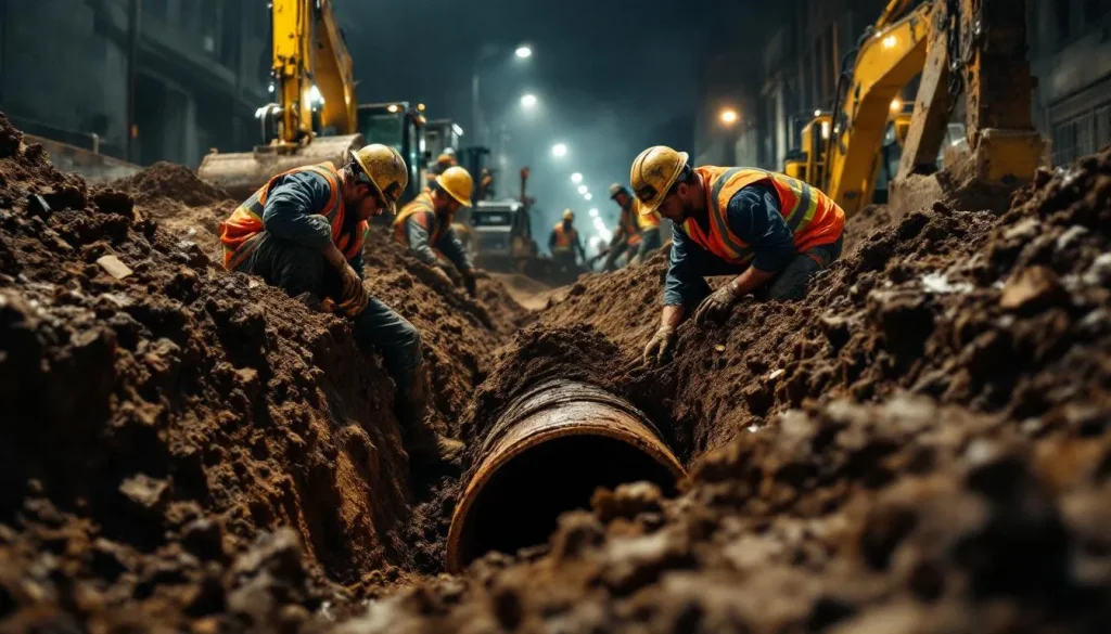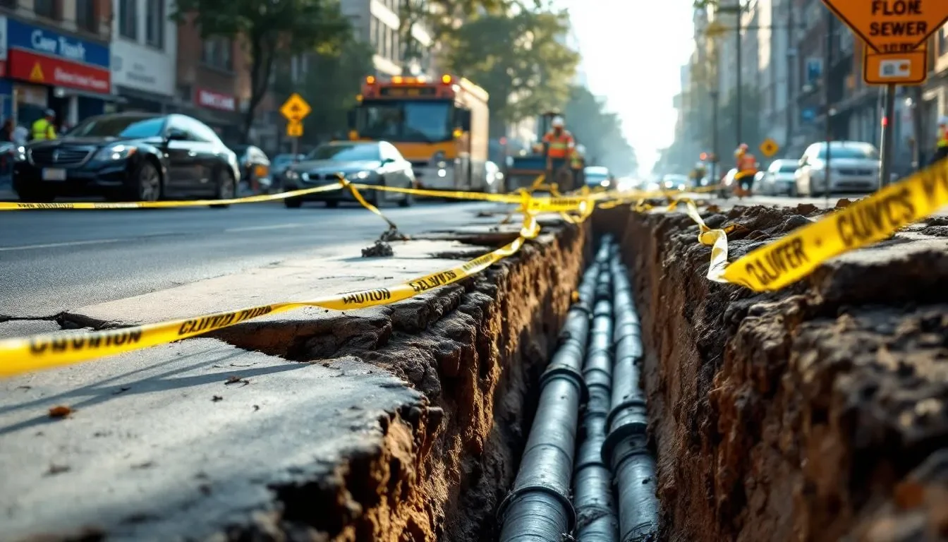 Construction work near sewer lines that can inadvertently damage them if not properly marked and avoided