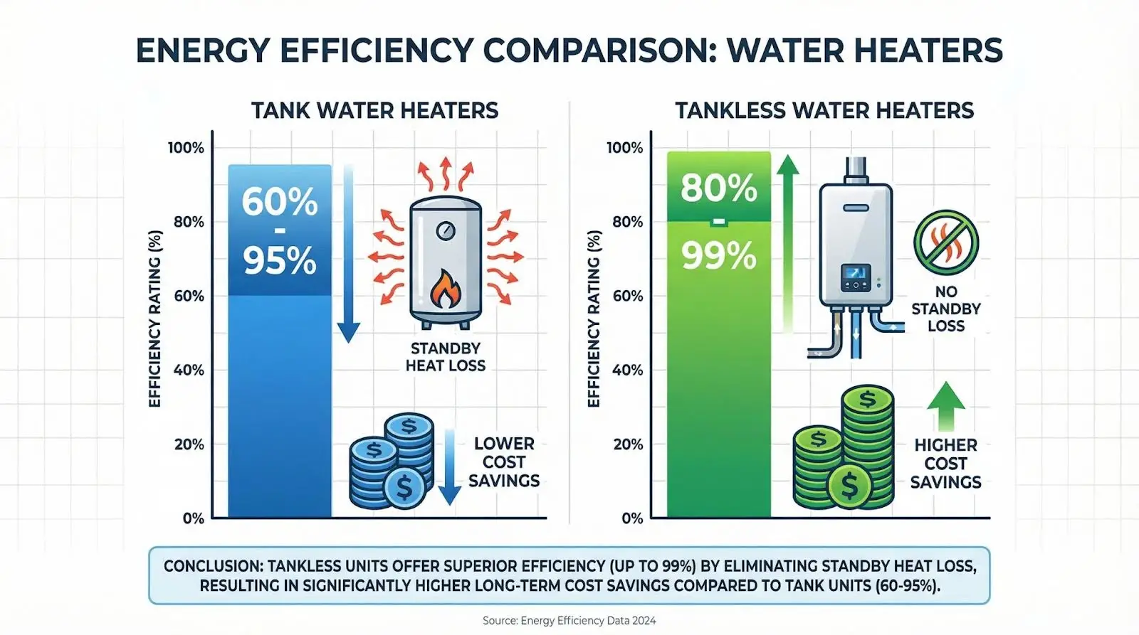 Gas-fired tankless water heaters achieve 80% to 98% efficiency ratings. Electric tankless units reach 98% to 99% efficiency. Without standby losses, these ratings reflect actual performance more accurately.