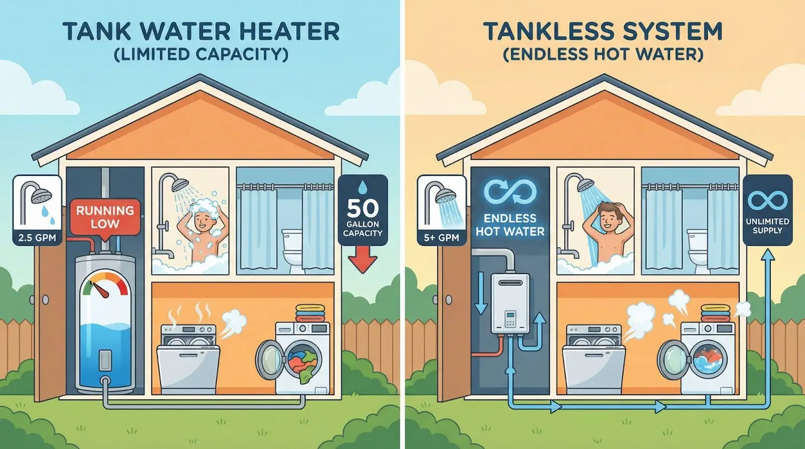 Large families in Marietta often struggle with tank units during high-demand periods. Running the dishwasher, doing laundry, and showering simultaneously can deplete even large tanks quickly.