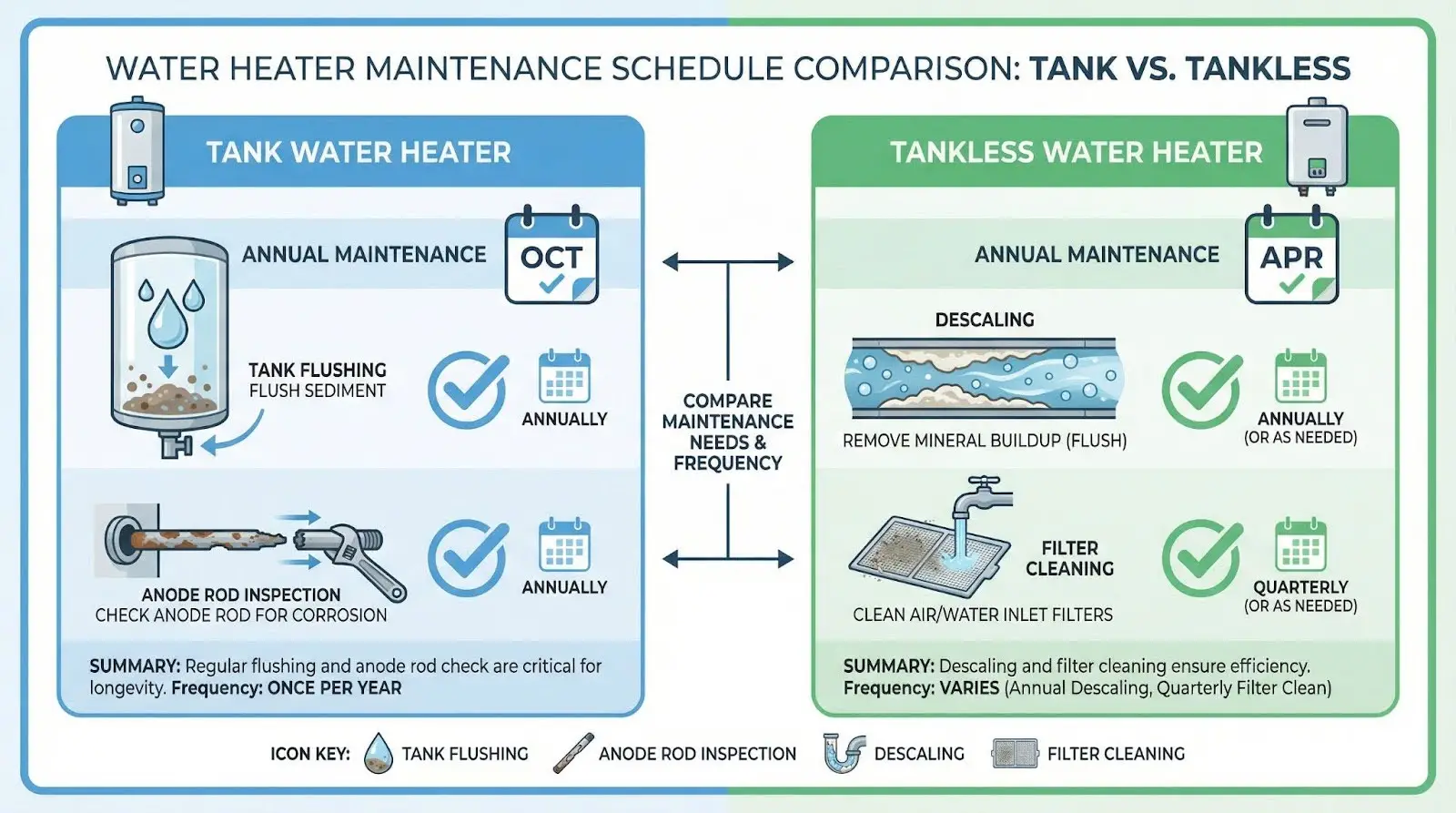 Regular maintenance extends equipment life and maintains efficiency for both water heater types.