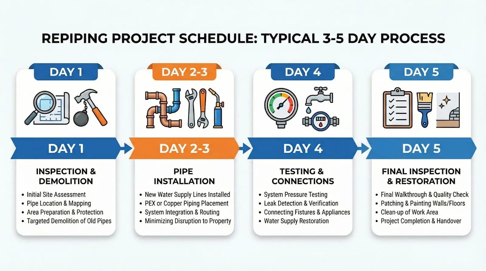 Most single-family homes require two to five days for complete repiping. This range accounts for typical house sizes and standard complexity levels.