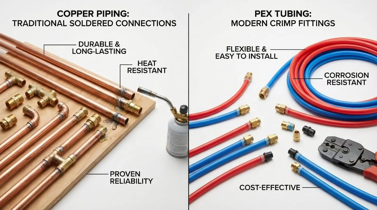 Modern repiping projects typically use either copper or PEX piping, each with distinct characteristics.